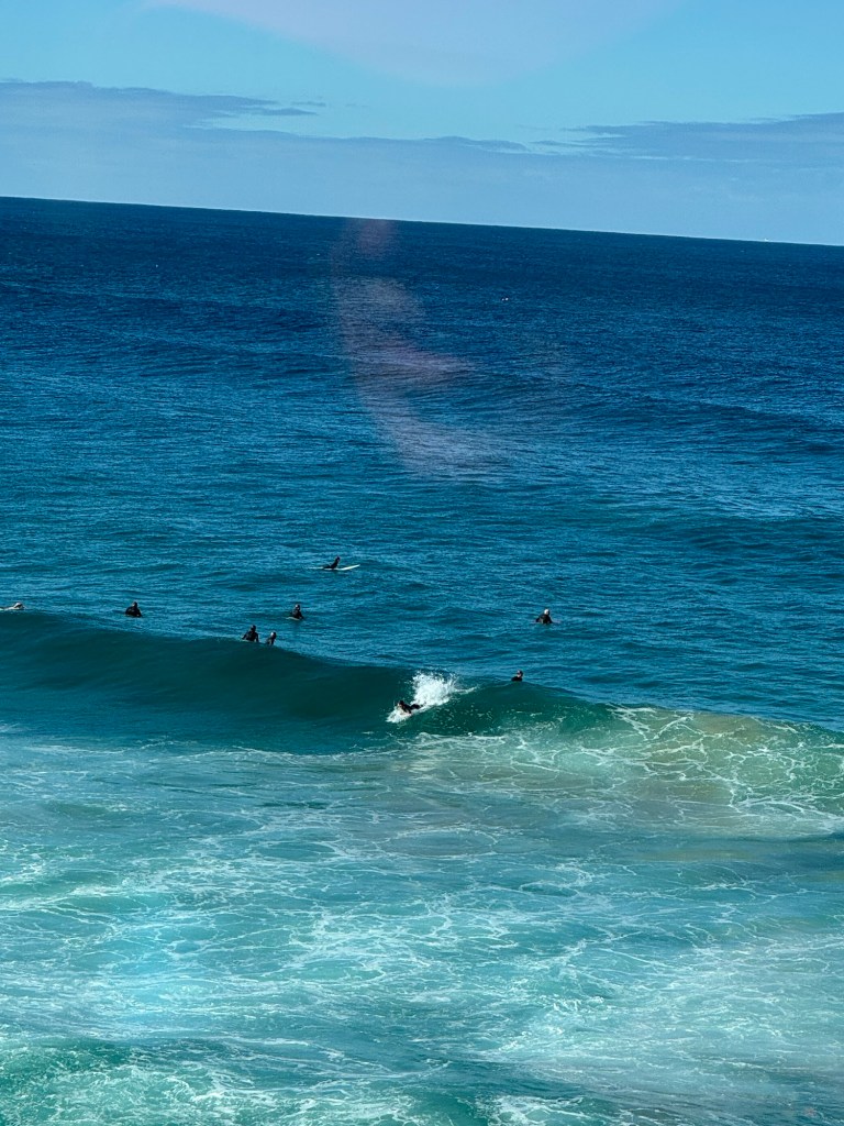 The beach was beautiful and we were lucky to get a table on the outside patio. We soon discovered that a great cure for jet lag is watching all the surfers wipe out in the waves! We do give them a lot of credit because it looked like paddling out to catch the waves is more work than fun. The beach is famous for the size of it’s surfing waves. We saw impressive waves batter the surfers but, to us, no surfer was spectacular. Obviously, there is a tremendous amount of skill required to catch a wave just right and ride the curl to the shore. Much less skill is required to sit on the balcony of the Bondi Iceberg Club, have lunch and a beer, and watch those brave souls wipe out.