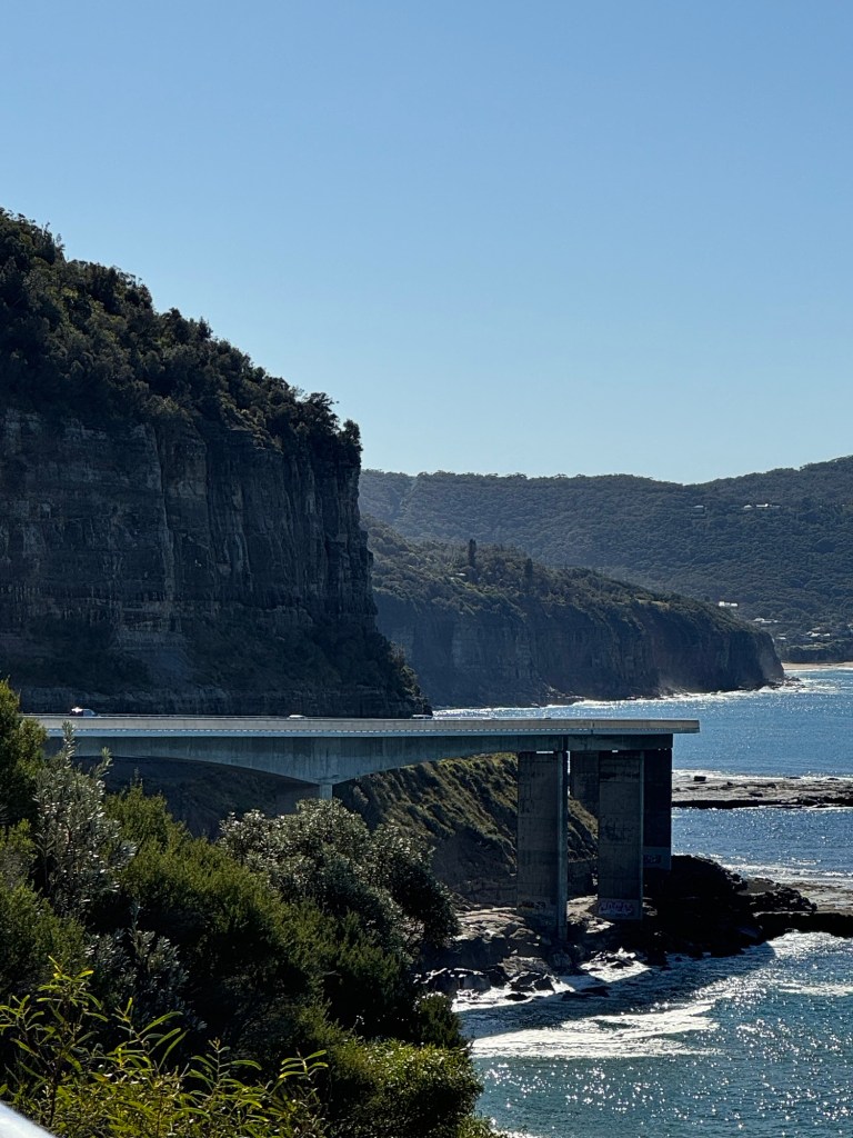 After we left the park we stopped at Bald Hill where gliders launch to the beach below. From here we also had a view of the Sea Cliff Bridge. Originally a road ran along the base of the cliffs. Erosion caused the rock face to fail and collapse onto the road which caused the road to collapse. The road was closed more than it was open. It was more economical to construct a bridge parallel to the cliffs and over the water to keep the road open than to keep repairing the road. When we drove along the Grand Pacific Drive and onto the bridge we were able to see the crumbling cliffs and the old road.