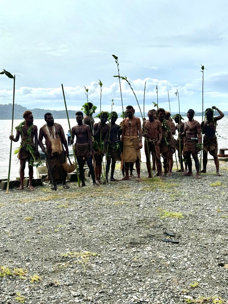 Upon our arrival on Tulagi we were greeted by a group of islanders dressed in traditional clothing and carrying spears. Their threatening gestures distracted us just enough to allow them to capture Miss Tourism, a contestant for the Miss Solomon Island pageant, who was traveling with us.