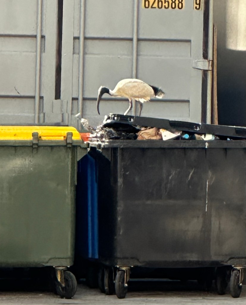 The Ibis is a protected bird species in Australia. The Ibis has long legs (about 12inches) with a beak almost as long as it’s legs. The best place to see an Ibis is at an outdoor eating area or atop a garbage can. Locally it is known as a “Bin Chicken”.